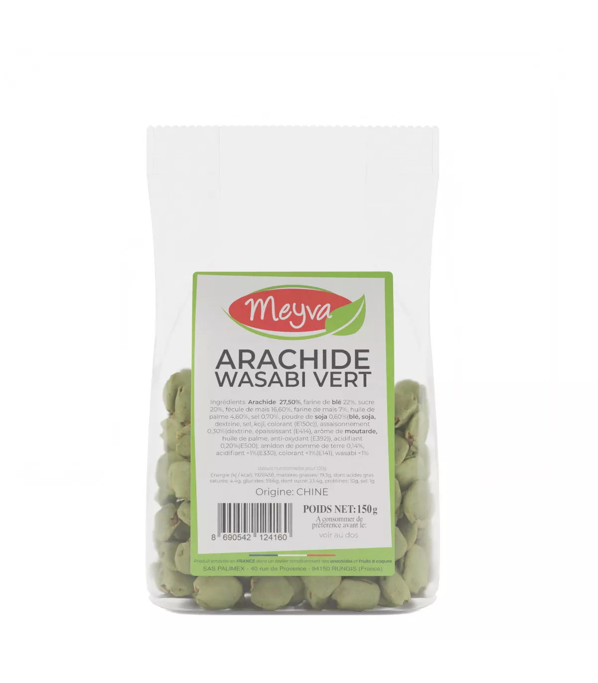 Zutaten: 57,49% Erdnuss, 22,09% Weizenmehl, Zucker 20,07%, Maisstärke 16,63%, Maismehl 7,12%, Palmöl 4,60%, Sel 0,65%, 0,62% Sojasauce, Gewürz von WasAabi 0,31%, Pulver zum Anheben von 0,23%, 0,14% Kartoffelstärke, GOÜT umfassender 0,03%, Nahrungsmittelsäure 0,02%, 0,1% Farbstoff, WASABI <1%.
