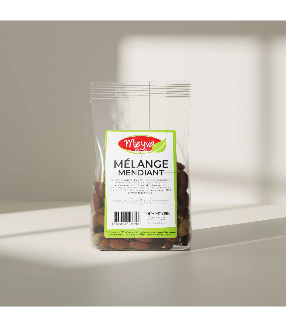 Zutaten: Roher Mandel Supreme Nonparet 23/25 16.00%, Cajah Nut W240 16.00%, grob Trichter 13/15 7,00%, trockene Traube Chile Jumbo dunkle Flamme 14,00%, goldene goldene Traube AFS 13,00%, Trockene Sultana-Türkei Raisin 14,00%, Goldener Jumbo AFS Raisin 18,00%.