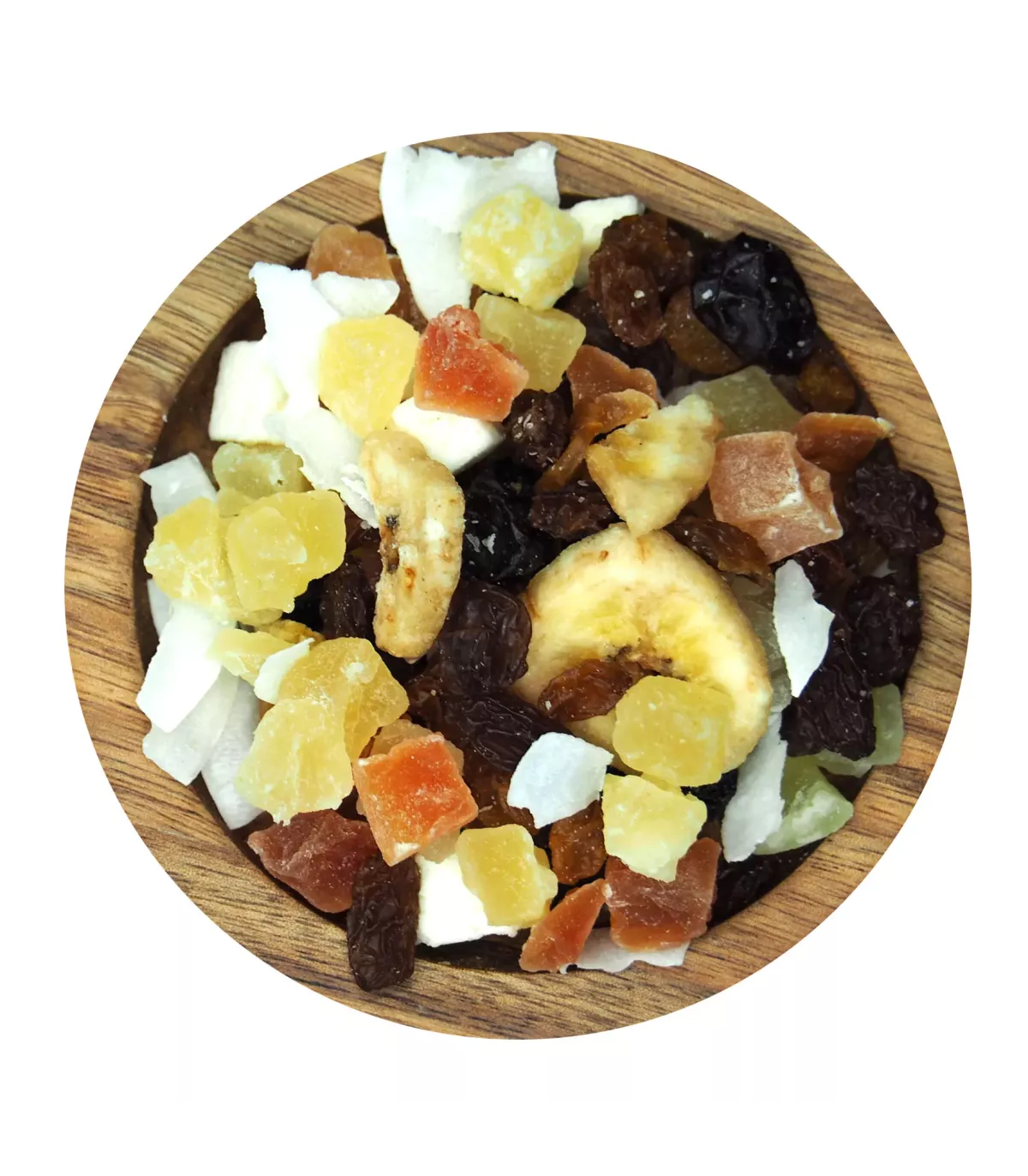 Zutaten: Goldene goldene Traube 17,00%, Bananen-Chips 12,00%, Ananas Cube 18,00%, Cube Papaya 18,00%, trockene Traube Chile Jumbo dunkle Flamme 13.00%, Coco Slate 4,00%, Sultanas Trockene Rosine 13,00%, Kokuswürfel weich 8-12 (Kokosnuss, Glukose und Fructosesirup, Dextrose, Weizenstärke, Rindfleischgelatine, Salz, Zucker) 6,00%, Pflanzenöl, Kurator (E220)
