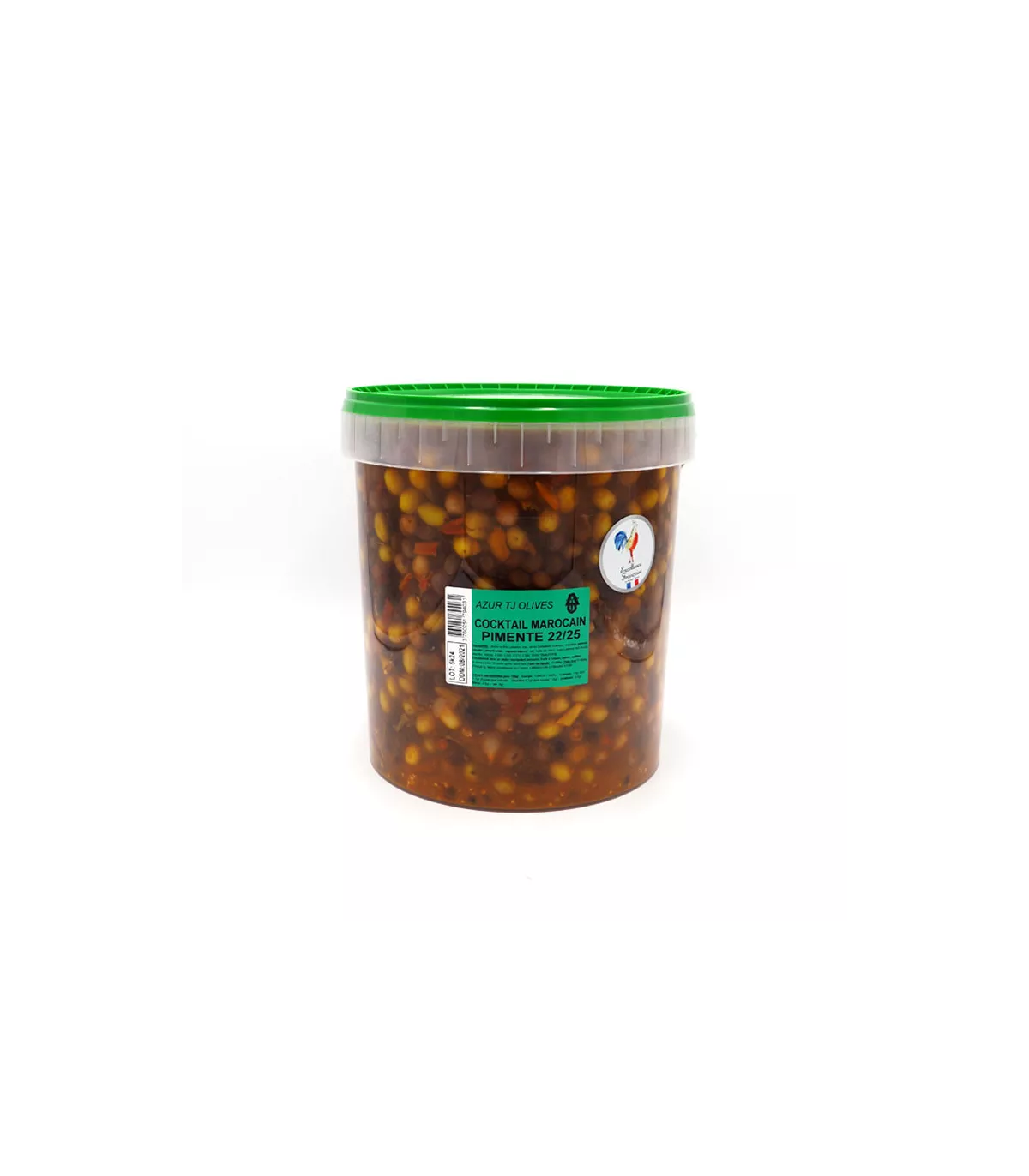 Discover the Moroccan Cocktail Olives Pedjacent 22/25, an exceptional product available in Bucket of 10 kg, specially designed to meet the needs of catering professionals, caterers, and fine grocery stores. This olive cocktail is carefully selected and prepared according to a traditional Moroccan recipe, offering an explosion of spicy and exotic flavors that will delight your customers.