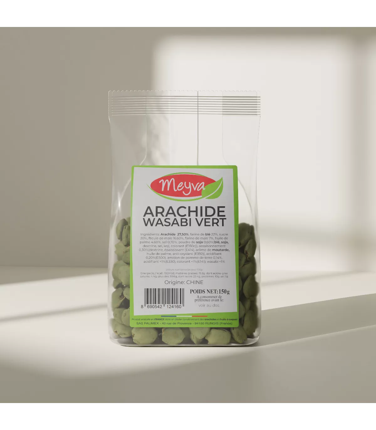 Ingredients: 57.49% peanut, 22.09% wheat flour, sugar 20.07%, corn starch 16.63%, corn flour 7,12%, palm oil 4.60%, SEL 0.65%, 0.62% Soy Sauce, Seasoning from Wasabi 0.31%, Powder to lift 0.23%, 0.14% potato starch, Goüt comprehensive 0.03%, food acid 0.02%, 0.1% dye, Wasabi <1%.