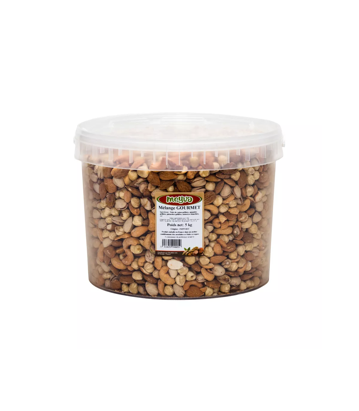 Ingredients: Grilled Cashew nuts 25,00%, grilled almonds 25.00%, grilled pistaches 25.00%, Whitening hazelnuts 24.99%, salt <1%.